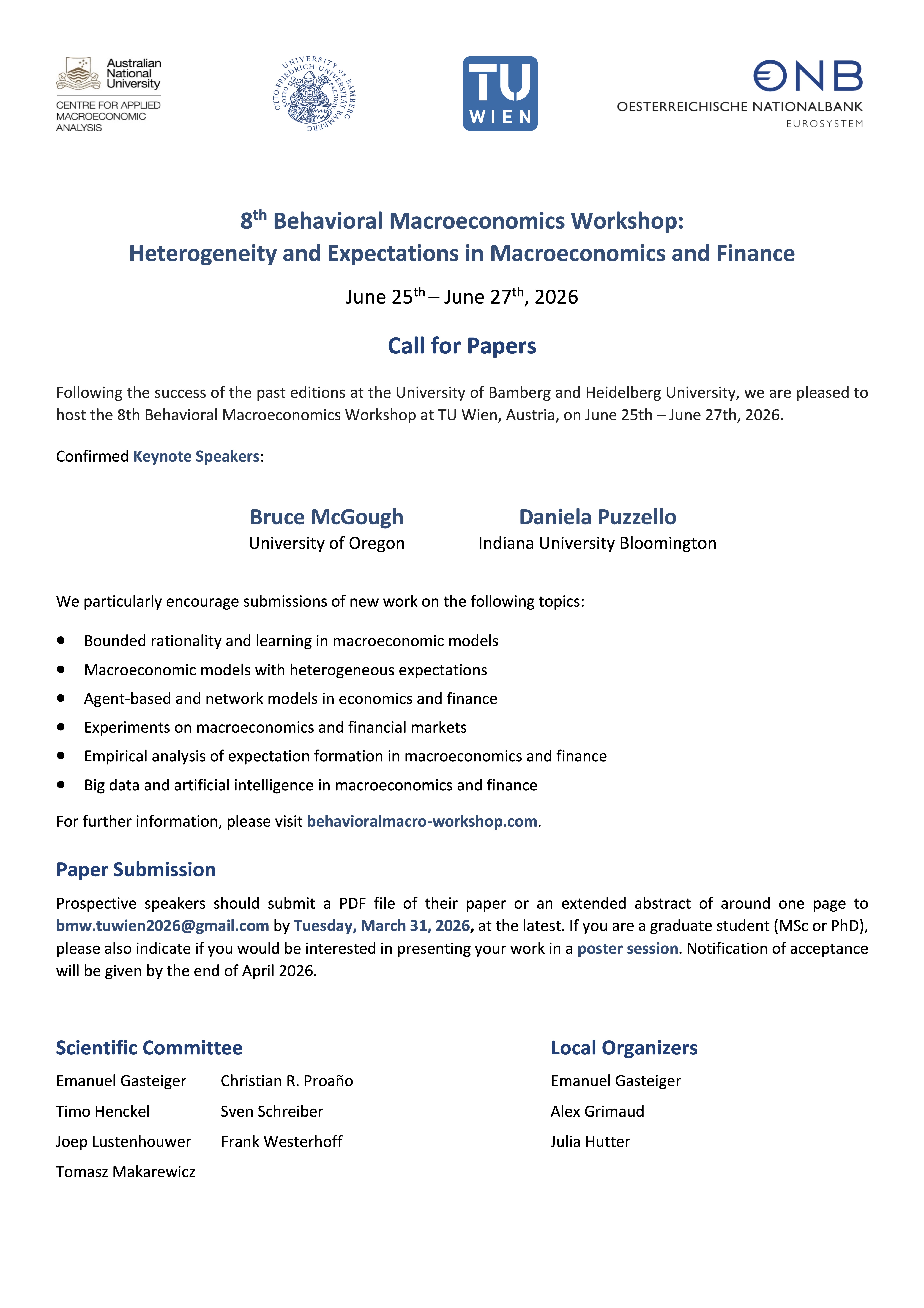 Some colleagues and me are organizing the 7th edition of the Behavioral Macroeconomics Workshop on June 26th – 28th, 2025 at the University of Bamberg. Submit your paper until March 31, 2025 via the website. |